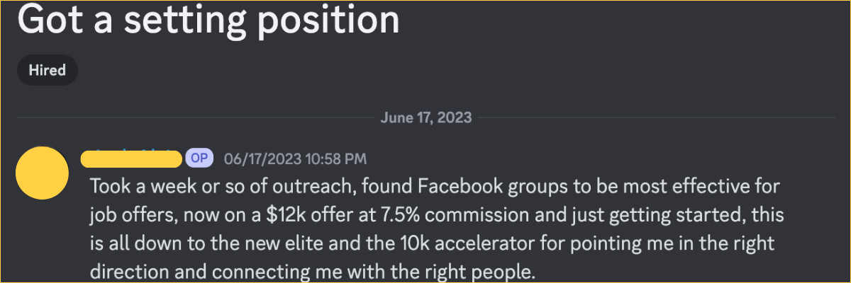 Within a WEEK landed a role earning 7.5% of a $12k offer ($900) from just ONE close. Only closing 1 call a day and he is earning $27,000+ per month.